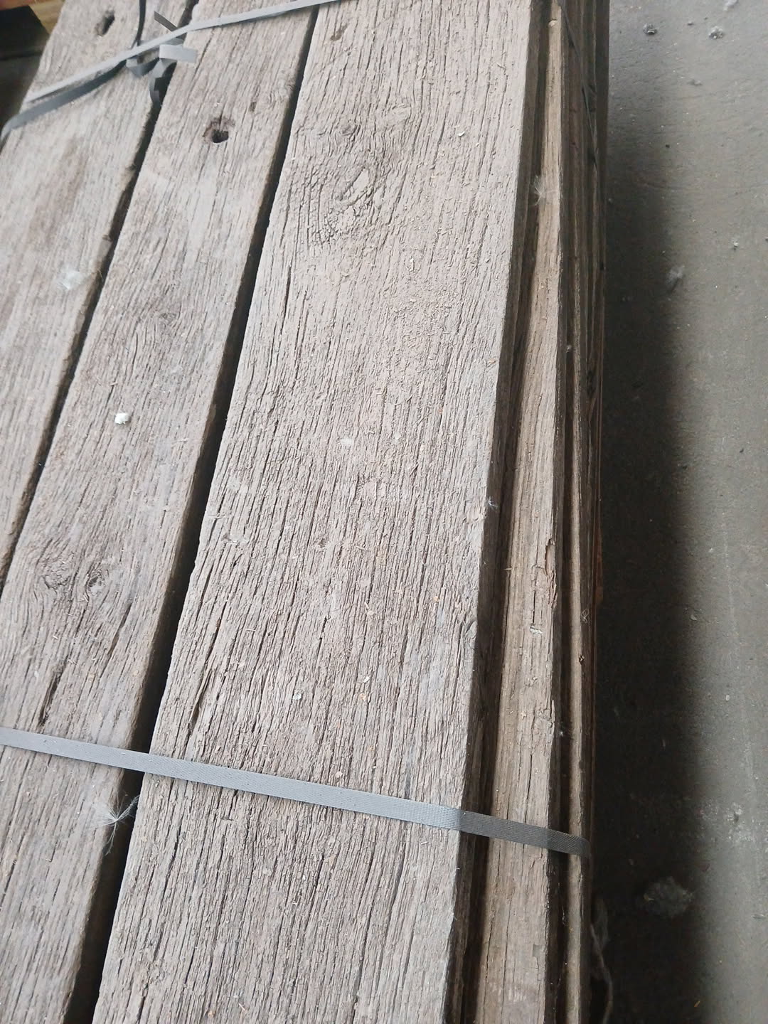 Bois brut non traité, avec présence possible de marques industrielles, anciennes fixations (clous), fissures, patines naturelles. Aspect rustique et authentique.