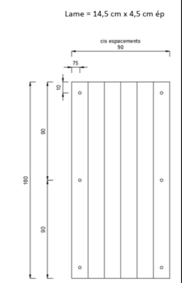 Sol, plancher, terrasse en bois extérieur, bardage (mural ou sous toiture), mobilier d’extérieur (tables, bacs, bancs), habillages ou platelages type loggia, passerelle, balcon.